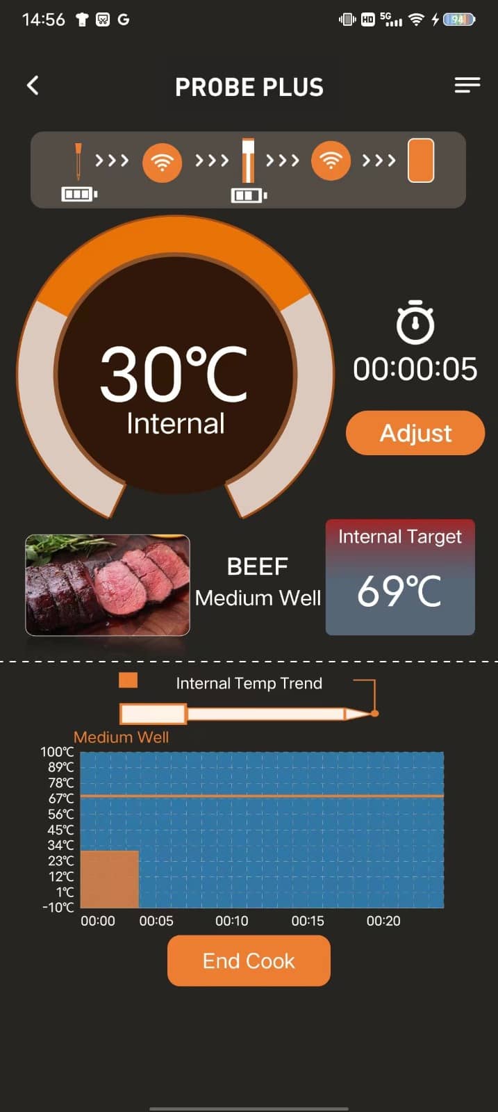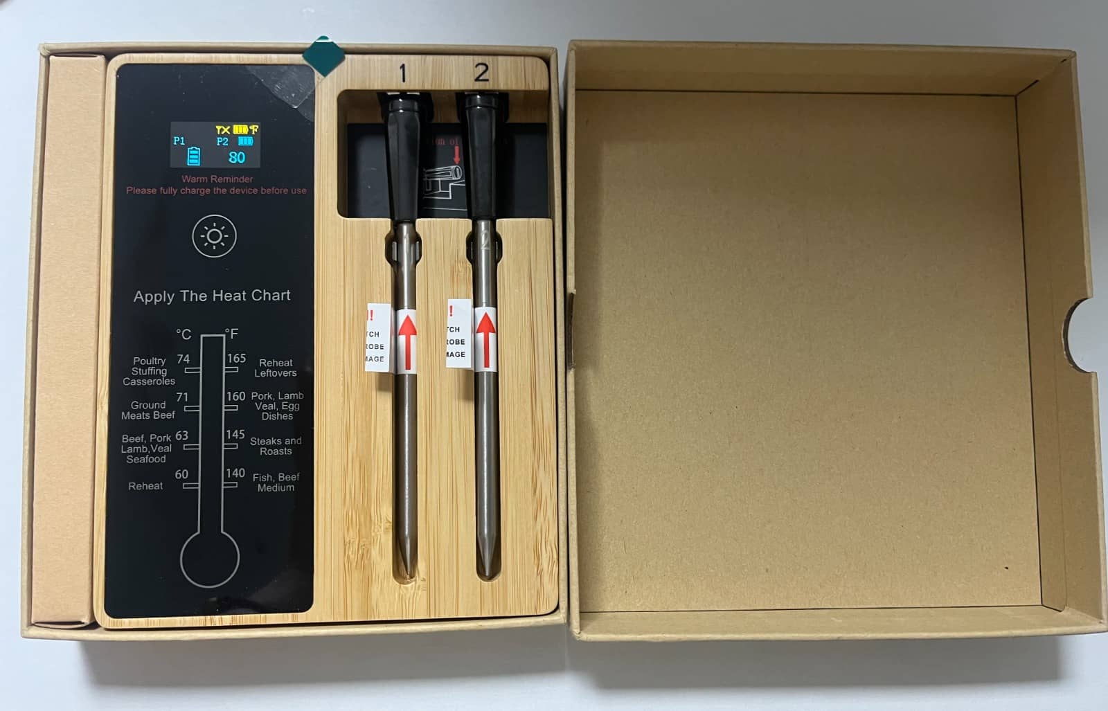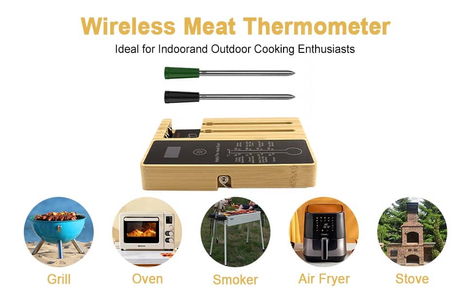 FM220 je brezžični pametni termometer z dvema sondama, idealen za žar, pečico, smoker, air fryer ali kuhanje na štedilniku. Ta naprava vam omogoča, da natančno spremljate notranjo temperaturo mesa, pa tudi temperaturo okolice, kar zagotavlja vrhunski nadzor nad pripravo hrane.